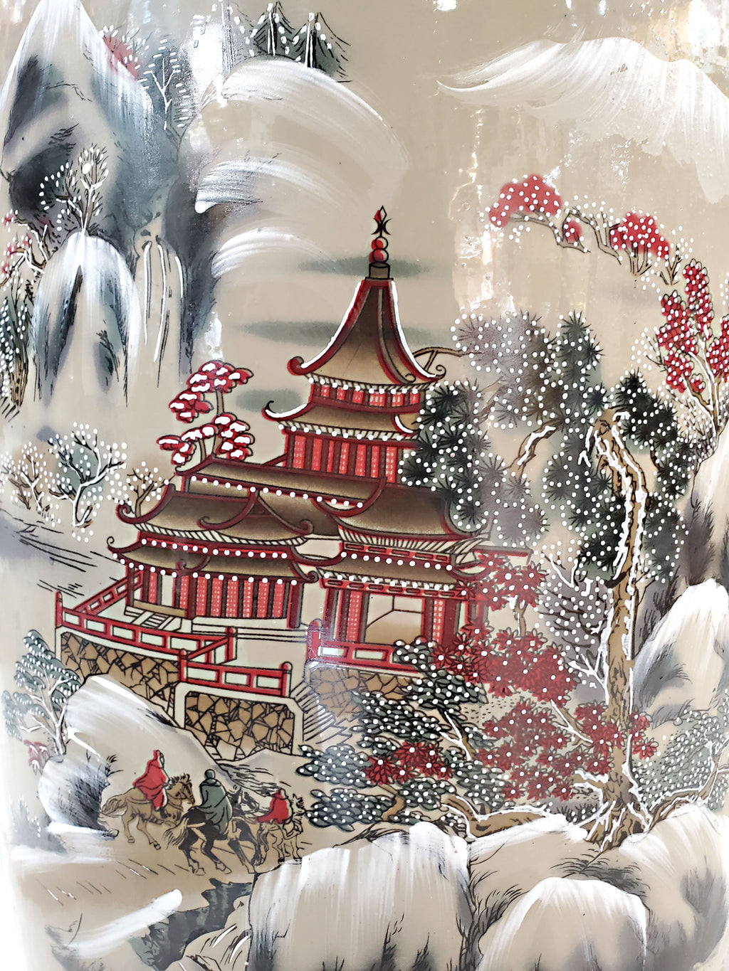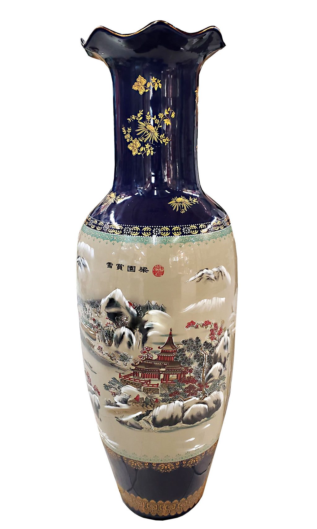 This ornate vase is beautifully painted in a combination of dark blue and cream. The brilliant gold accents, coupled with the stunningly painted imagery of a feudal japanese home, combine to create an eye-catching ornamental piece for the foyer or hallway of your home. The vase stands 42" in heigh, and has a diameter of 14" around the thickest part. LOCAL PICKUP ONLY.